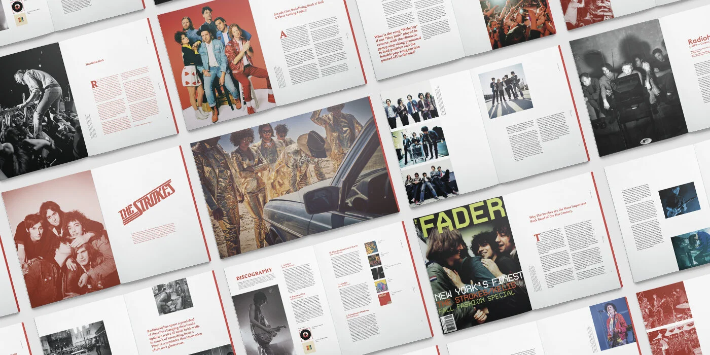 This project is a 160 page book that archives 21st century rock bands in the middle of their careers. These bands are Arcade Fire, The Strokes, and Radiohead.